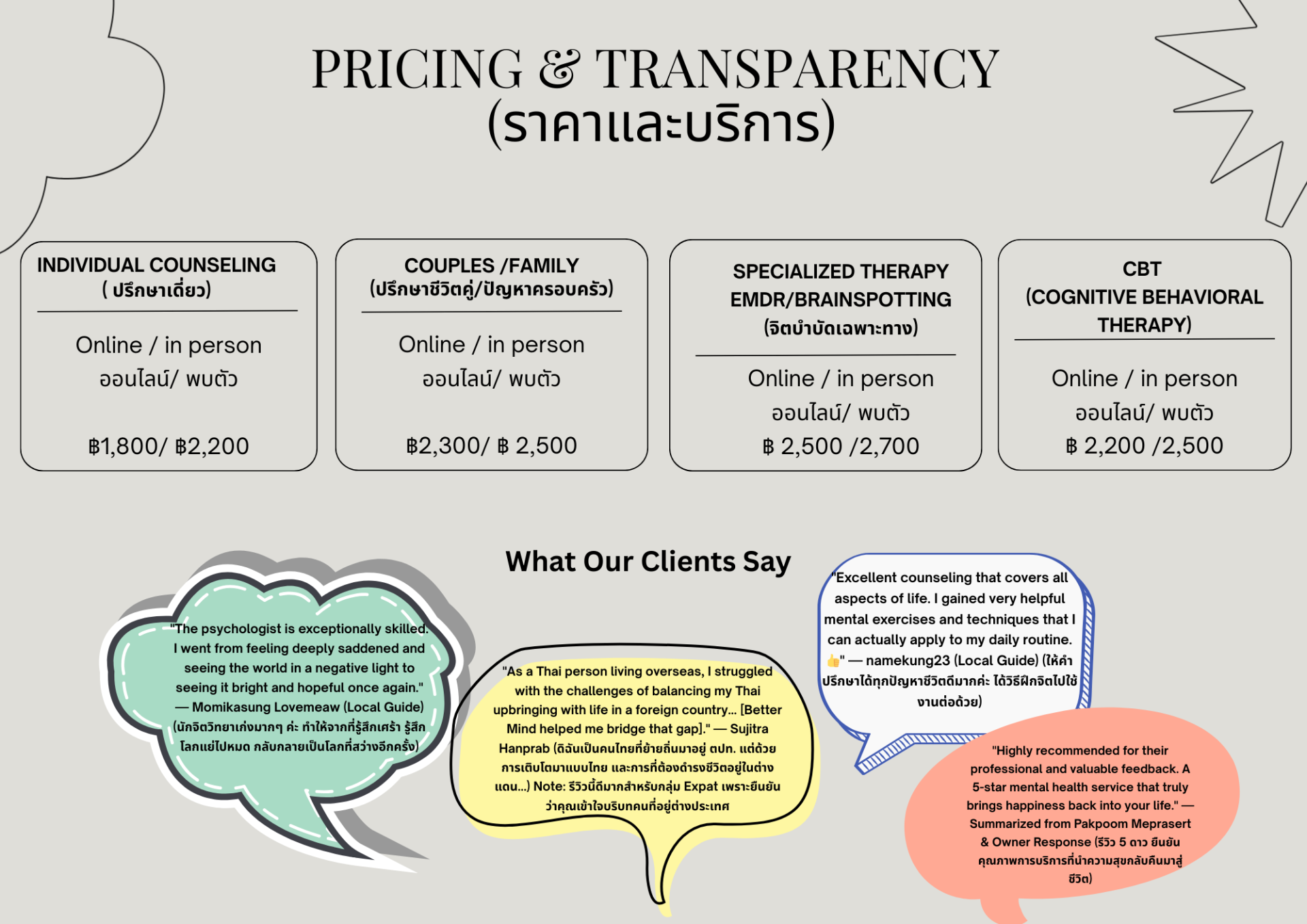 พร้อมการบำบัดด้วยเทคนิคสากล (EMDR, Brainspotting) ทั้งแบบพบตัวและออนไลน์"