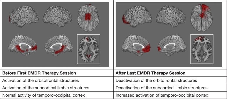 แต่เมื่อได้รับการบำบัดด้วยกระบวนการทางจิตบำบัดอีเอ็มดีอาร์จนถึงขั้นตอนสุดท้ายได้ค้นพบว่าสมองมีการเปลี่ยนแปลงในส่วนที่ทำให้เกิด PTSD เนื่องจากจิตบำบัดอีเอ็มดีอาร์ ไปช่วยกระตุ้นสมองสองด้านที่เก็บความทรงจำและประสบการณ์อันเลวร้ายนี้ไว้และทำให้เกิดการเคลื่อนย้ายออกไปทำให้เกิดการเชื่อมต่อกับสมองส่วนในที่เคยถูกแช่แข็งไว้ ทำให้การทำงานด้านประสาทและต่อมไร้ท่อต่างๆ รวมถึงทำให้เซลล์ประสาทของสมองเกิดการเคลื่อนไหวได้ดีขึ้นอย่างเป็นปกติด้านความทรงจำ ความคิด การเรียนรู้ ความมีเหตุผล การแก้ปัญหา ด้านอารมณ์ ด้านสติ ด้านการรับรู้ประสาทสัมผัสต่างๆก็กลับมาทำงานได้อย่างปกติหลังจากได้รับการทำจิตบำบัดอีเอ็มดีอาร์