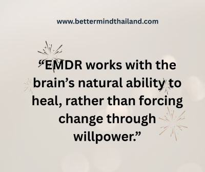 EMDR คือการช่วยให้สมอง “จัดระเบียบความทรงจำร้าย ๆ ใหม่” เวลาที่เราผ่านเหตุการณ์สะเทือนใจ สมองอาจเก็บความทรงจำนั้นไว้แบบค้างคา EMDR ใช้การขยับตาหรือการกระตุ้นซ้าย–ขวา เพื่อช่วยให้สมองประมวลเรื่องนั้นเหมือนความทรงจำปกติ ทำให้คิดถึงแล้วไม่รู้สึกเจ็บปวดเท่าเดิม